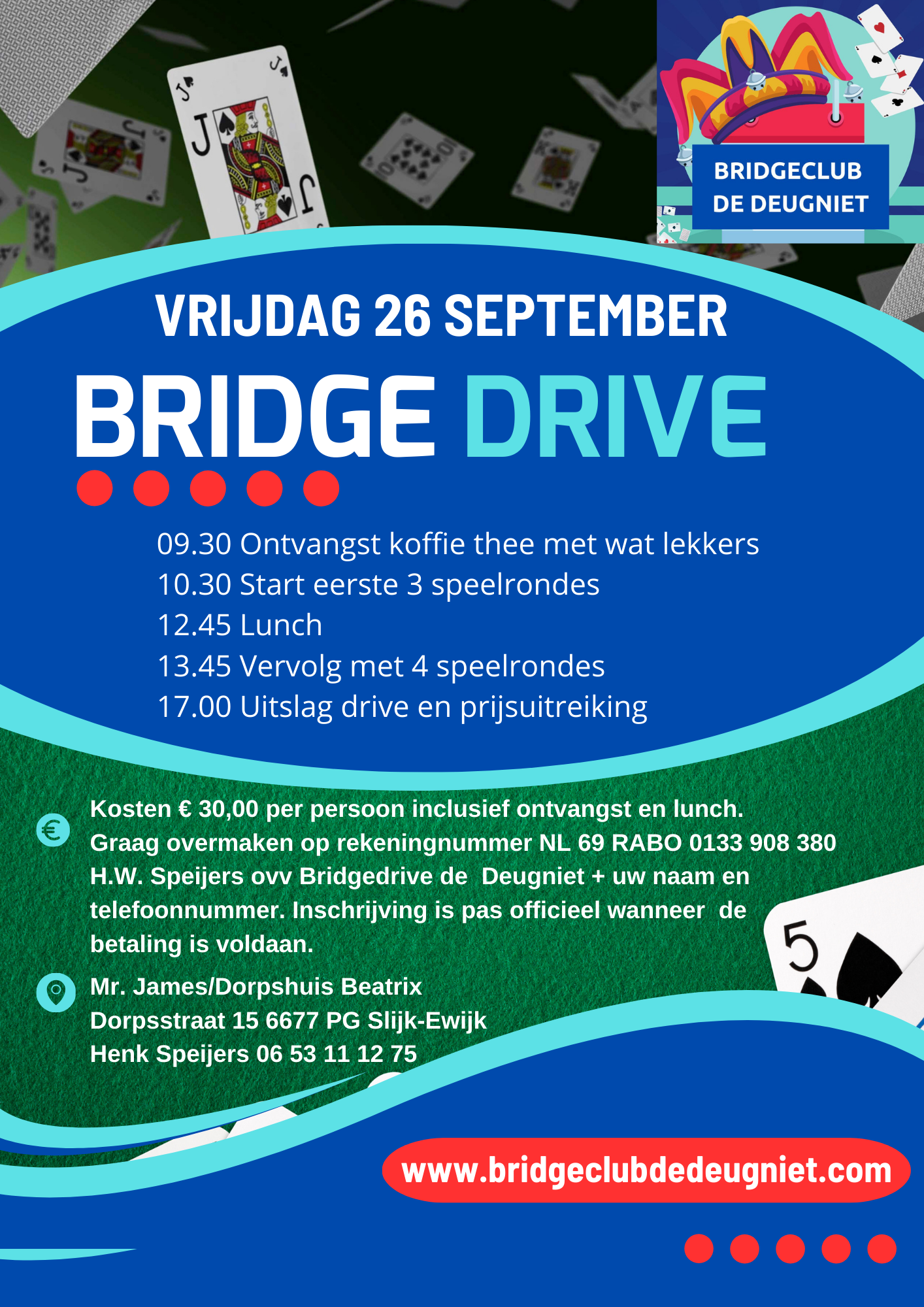 Welkom op de website van bridgeclub de Deugniet. We houden u hier op de hoogte van verschillende evenementen en nieuwtjes. Mochten er vragen zijn schroom dan niet op deze te stellen via onderstaande button.